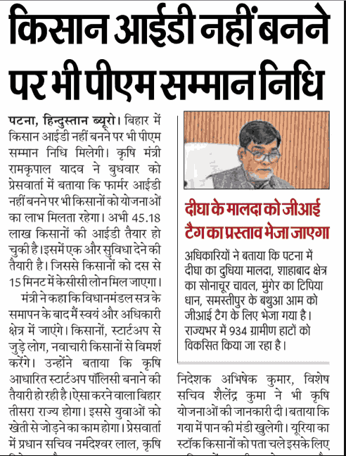 बिहार सरकार के नए फैसले के अनुसार अब राज्य के किसानों को Farmer ID नहीं बनने पर भी प्रधानमंत्री किसान सम्मान निधि योजना के तहत आर्थिक सहायता मिलती रहेगी।